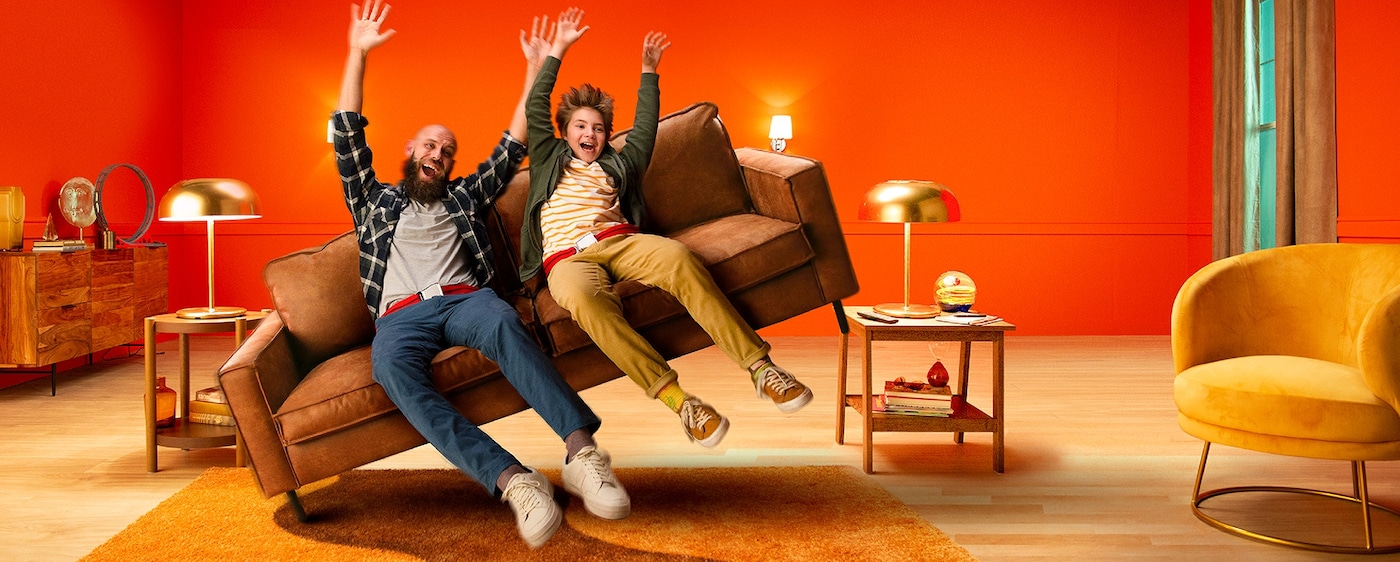 Современная гостиная, мама с дочкой подпрыгивают, держась за руки, на фоне желтой контрастной стены.